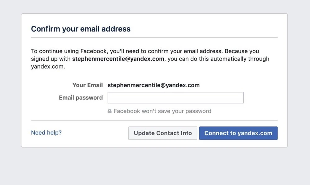 Tuy nhiên, mới đây Facebook đã yêu cầu người dùng mới (sử dụng email của Yandex hoặc GMX) xác nhận lại địa chỉ email bằng cách nhập trực tiếp mật khẩu vào Facebook.