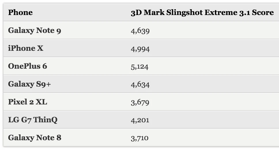 Slingshot Extreme là bài kiểm tra đồ họa khắt khe nhất của 3DMark. Galaxy Note 9 ghi được 4,639 điểm, tốt hơn một chút so với Galaxy S9 Plus (4,634) và LG G7 (4,201). Trong khi đó vị trí đầu tiên thuộc về OnePlus 6 với 8 GB RAM với 5,124 điểm; iPhone X đứng ở vị trí thứ hai với 4,994 điểm.