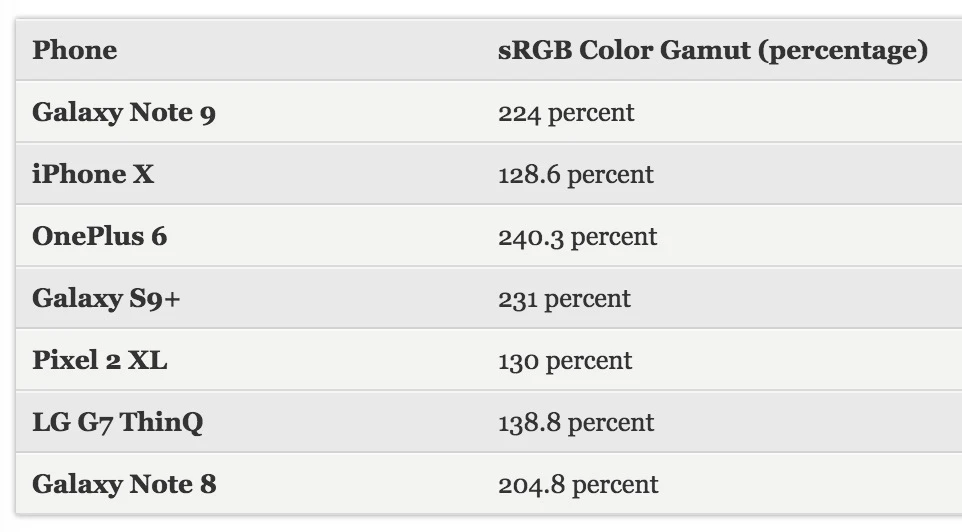 Một lần nữa màn hình AMOLED của Note 9 lại thể hiện sự vượt trội, máy đạt 224% gam màu sRGB, tốt hơn nhiều so với 128,6% của iPhone và LG G7 (138,8%). Tuy nhiên, vị trí dẫn đầu vẫn thuộc về OnePlus 6 với 240,3%.