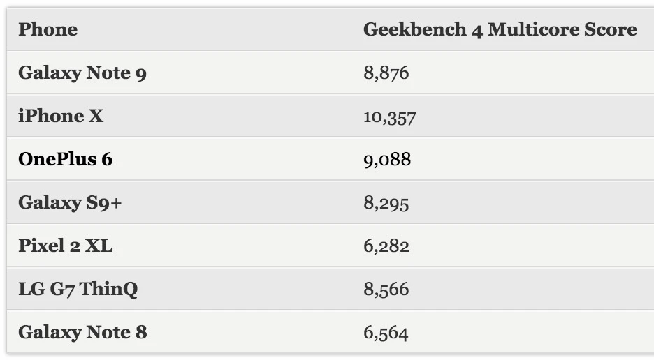 Phần mềm Geekbench 4 sẽ đo lường hiệu suất tổng thể của thiết bị (đa lõi). Trong bài kiểm tra này, Note 9 chỉ đạt 8,876 và đứng ở vị trí thứ ba sau iPhone X (10,357 điểm) và OnePlus 6 (9,088 điểm). OnePlus 6 được trang bị 8 GB RAM và có giá chỉ tương đương Note 8 (579 USD), trong khi đó, nếu muốn sở hữu Note 9 phiên bản 8 GB RAM, bạn phải trả đến 1,249 USD.