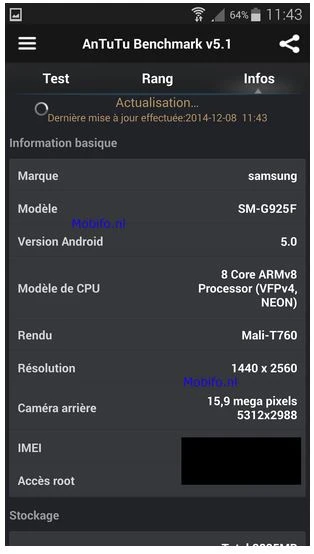 Lần rò rỉ này, lại một lần nữa khẳng định với giới công nghệ rằng Samsung Galaxy S6 vẫn có màn hình với độ phân giải QHD (1440 x 2560 px). Bên trong trang bị chip tám nhân ARMv8 và bộ xử lý đồ họa Mali-T768. Đây chính là Chip Samsung Exynos 7420 có kiến trúc 64-bit mới của Samsung với tốc độ 1.8 GHz và được làm theo quy trình 20nm, kết hợp với modem mạng 4G LTE Cat.10.