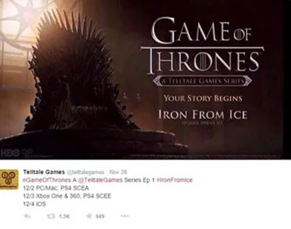 Theo đó, Episode 1 của Game of Thrones sẽ có mặt trên PC/Mac và PS4 (Bắc Mỹ) vào ngày 02/12. Ngày 03/12, game sẽ đổ bộ lên 2 hệ máy Xbox One, Xbox 360 và PS4 (Châu Âu), ngày 04/12 game sẽ cập bên lên iOS. Cùng thời điểm này, một tựa game khác của hãng là Tales from the Borderlands cũng cho ra mắt phần 1.