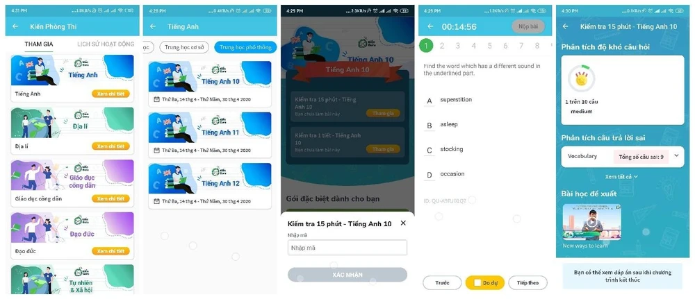 Thời gian làm bài, số câu hỏi được thiết lập trong quá trình tạo bài kiểm tra. Học sinh làm bài xong có thể biết kết quả ngay lập tức, đáp án chi tiết sẽ được hiển thị khi kỳ kiểm tra kết thúc.