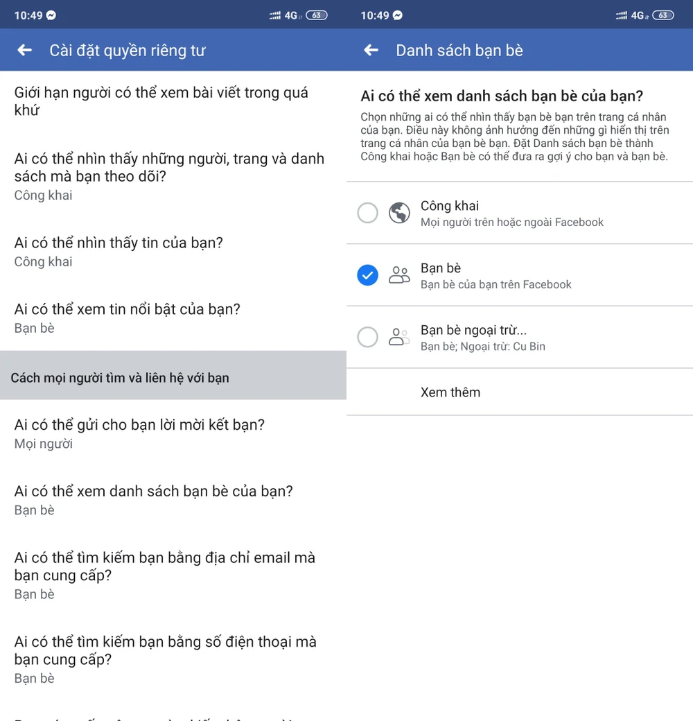 - Ngoài ra, bạn cũng nên ẩn luôn danh sách bạn bè bằng cách mở ứng dụng Facebook, truy cập vào phần Settings & Privacy (cài đặt & quyền riêng tư) > Settings (cài đặt) > Privacy Settings (cài đặt quyền riêng tư) > Who can see your friends list (ai có thể xem danh sách bạn bè của bạn) > Only me (chỉ mình tôi) hoặc Friends (bạn bè).