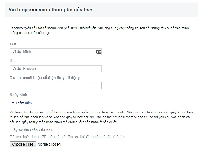 Tiếp theo, người dùng hãy truy cập vào địa chỉ http://bit.ly/fb-disabled để gửi khiếu nại. Trong cửa sổ mới hiện ra, bạn điền đầy đủ các thông tin cần thiết bao gồm số điện thoại/email dùng để đăng nhập, tên tài khoản, nhấn Choose Files và tải lên ảnh chụp giấy tờ tùy thân (hai mặt).