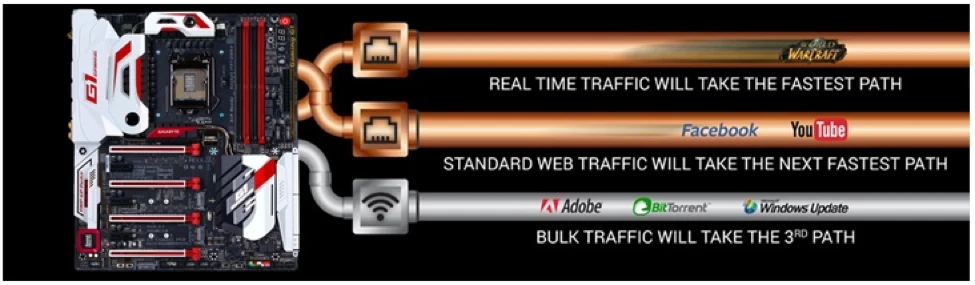 Bo mạch chủ cao cấp GIGABYTE Z170 kết hợp card mạng Dual Gigabit LAN Killer E2400 với card Wi-Fi Killer 1535 chuẩn 802.11ac cùng với Bluetooth 4.1. Ứng dụng Killer DoubleShot-X3 Pro có thể ưu tiên và chuyển hướng các gói lưu thông mạng quan trọng nhất sang nơi có băng thông trống trải, đảm bảo nó không ảnh hưởng đến các game trực tuyến của bạn.