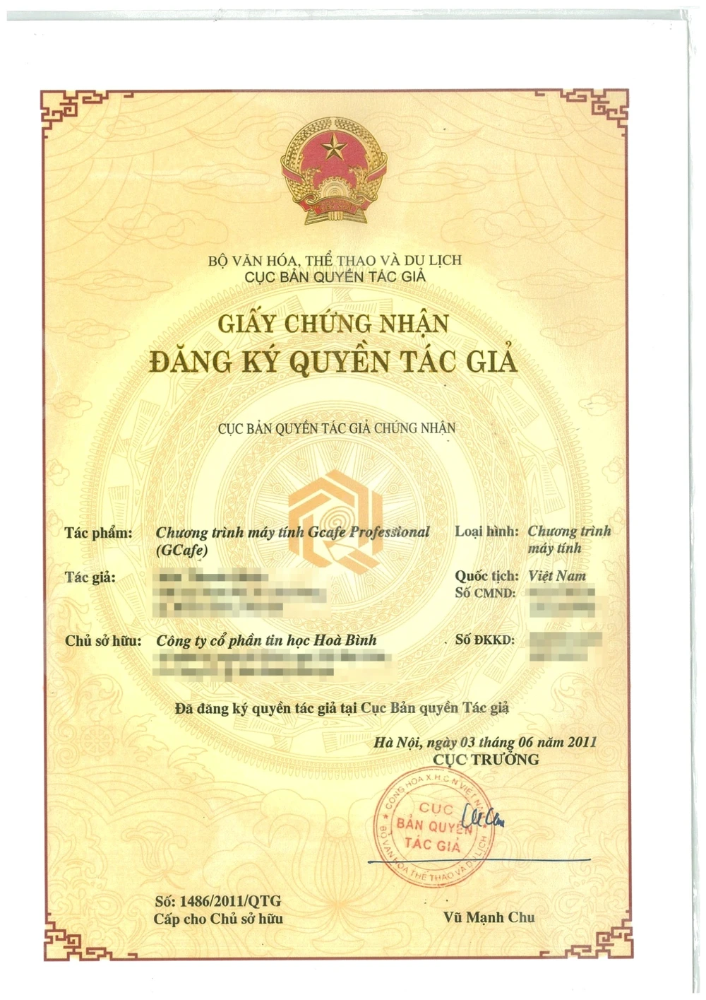 Bản scan giấy chứng nhận đăng kí quyền tác giả Gcafe