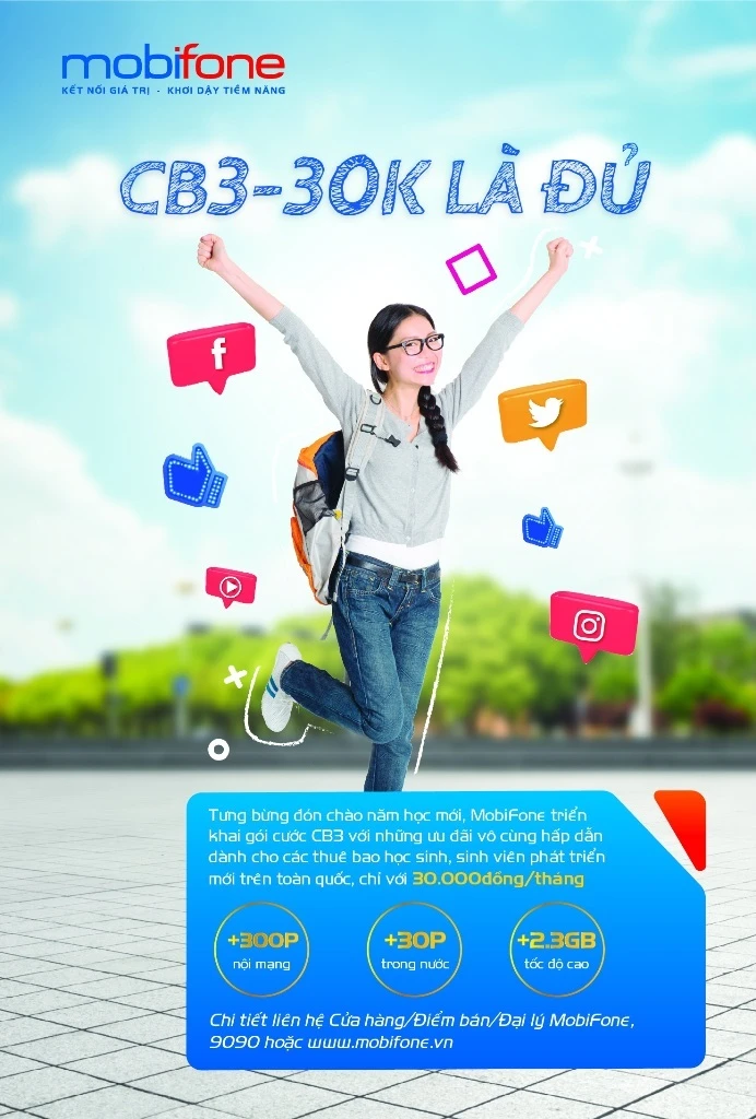 Hướng tới nhóm khách hàng là học sinh, sinh viên, MobiFone mới cho ra mắt gói cước CB3 với mức giá rẻ chỉ với 30.000 đồng/tháng. Khách hàng đăng ký gói cước này sẽ được sử dụng trọn gói ưu đãi thoại và data trong vòng 30 ngày.