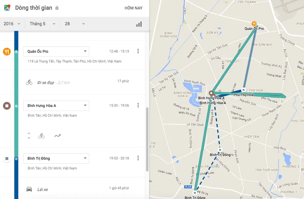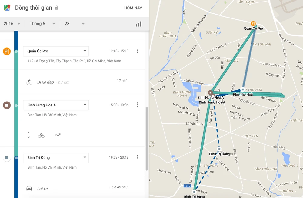 Mặc định, Google sẽ lưu lại tất cả địa điểm mà bạn đã từng đến và đi cùng các mốc thời gian tương ứng. Nếu muốn xem lại, bạn chỉ cần truy cập vào địa chỉ https://www.google.com/maps/timeline, lựa chọn ngày, tháng, năm cần xem và chờ một lát để dữ liệu được tải hoàn tất.