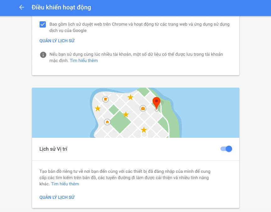 Tại đây gồm có các tùy chọn Hoạt động web và ứng dụng, Lịch sử vị trí (chính là những địa điểm mà bạn đã đến), Thông tin thiết bị, Hoạt động bằng giọng nói và âm thanh, Lịch sử tìm kiếm và các video đã xem trên YouTube… Nếu muốn bảo mật thông tin cá nhân, bạn có thể tắt bớt các tùy chọn không cần thiết bằng cách kích vào nút gạt màu xanh ở ngay bên cạnh.