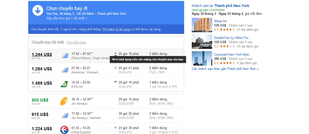 Trong những lần tìm kiếm thông tin về những chuyến bay trên Google tiếp theo, bạn sẽ thấy biểu tượng WiFi, ổ cắm điện, hoặc một số thông tin về tiện nghi trên máy bay ngay bên cạnh kết quả tìm kiếm.