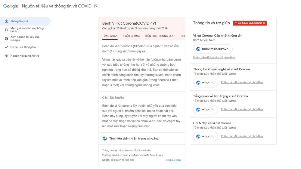 Google chính thức ra mắt trang tổng hợp nguồn Tài liệu và Thông tin về COVID-19 bằng tiếng Việt tại địa chỉ google.com/covid19 giúp người dùng nắm bắt những thông tin quan trọng đáng tin cậy từ Bộ Y Tế Việt Nam như mẹo an toàn, cách phòng bệnh, một cách trực quan, dễ dàng và nhanh chóng.