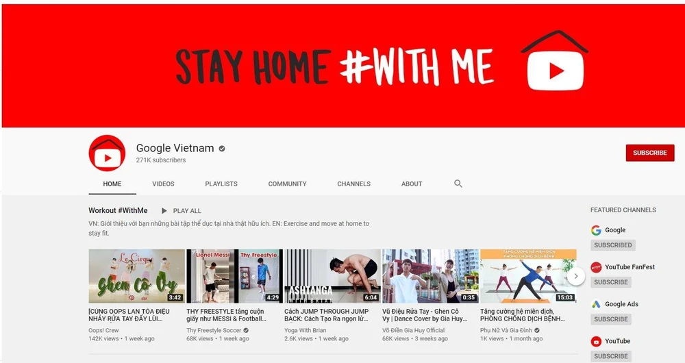 Hưởng ứng lời kêu gọi giãn cách xã hội cách ly tại nhà để chung tay phòng chống sự lây lan của dịch COVID-19, Kênh YouTube Google Vietnam đã thay đổi diện mạo mới để khởi động chiến dịch #StayHome #WithMe - Ở nhà Cùng Tôi trên toàn cầu.