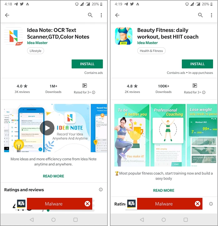 Theo thống kê, hai ứng dụng Idea Note: OCR Text Scanner, GTD, Color Notes, và Beauty Fitness: Daily workout, best HIIT coach đã có hơn 1,5 triệu lượt tải về trên Google Play.