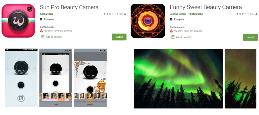 Theo các nhà nghiên cứu tại Wandera, hai ứng dụng Sun Pro Beauty Camera và Funny Sweet Beauty Camera yêu cầu khá nhiều quyền hạn vô lý khi cài đặt, cho phép chúng ghi lại âm thanh mà không cần sự đồng ý của người dùng. Quảng cáo có thể xuất hiện toàn màn hình kể cả khi bạn không mở ứng dụng, gây nhiều phiền toái khi sư dụng và khiến smartphone hết pin nhanh hơn.