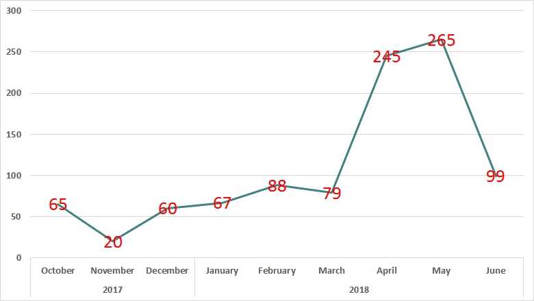 Số lượng máy tính bị tấn công từ tháng 10-2017 đến tháng 6-2018. Ảnh: Kaspersky