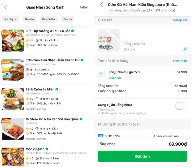 Thay vào đó, GrabFood hướng người dùng chuyển sang sử dụng hộp bã mía thay cho hộp xốp, đồng thời tìm kiếm các giải pháp thay thế túi nylon bằng cách thử nghiệm cung cấp túi giấy tái chế thân thiện môi trường cho một số đối tác nhà hàng, quán ăn nhất định được liệt kê trong danh mục “Giảm nhựa sống xanh".