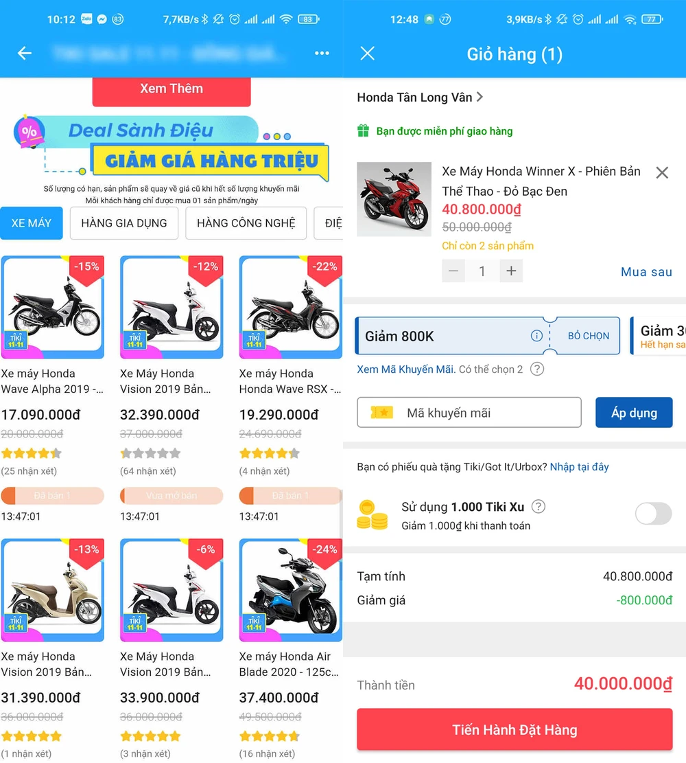 Cụ thể, trên trang TMĐT Tiki, trong thời điểm khuyến mãi mẫu xe tay ga Honda Air Blade 2020 hiện đang được bán giảm giá chỉ còn 37,4 triệu đồng, trong khi trên thị trường giá của mẫu xe này dao động ở mức hơn 41,5 triệu đồng (tùy từng đại lý).
