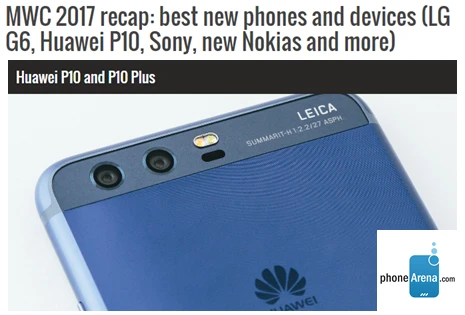 FoneArena đã bình chọn Huawei P10 với giải thưởng “Editor’s Pick of MWC 2017”. Sự lựa chọn hoàn hảo của thiết bị với những màu sắc thời thượng và đặc biệt là camera kép. FoneAreana có 7.9 triệu độc giả một tháng.