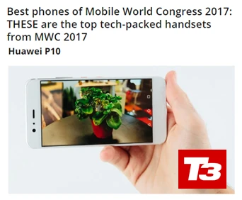 Còn T3 lại trao cho Huawei P10 giải thưởng “Giải thưởng MWC 2017: Điện thoại xuất sắc nhất.” Các nhà báo công nghệ đặc biệt ấn tượng bởi thương hiệu máy ảnh chuyên nghiệp Leica gắn liền với chiếc điện thoại thông minh Huawei ở cả ống kính trước và sau”, ngoài ra trang báo cũng nhấn mạnh công nghệ pin siêu nhanh của Huawei. T3 có 2.4 triệu độc giả mỗi tháng.