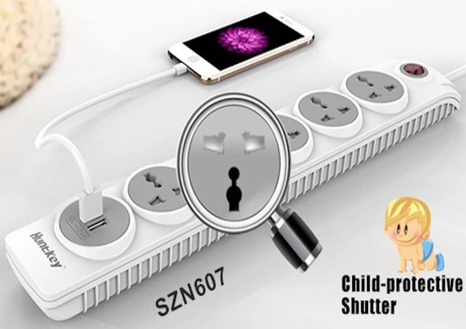 Mẫu ổ cắm điện SZN607 là mẫu ổ cắm điện mới nhất trong dòng sản phẩm SZN với 5 lỗ điện và 2 cổng sạc USB, cung cấp điện năng cùng lúc cho bảy thiết bị. Đặc biệt nhất là SZN607 được trang bị công nghệ bảo vệ trẻ em trên từng ổ điện.