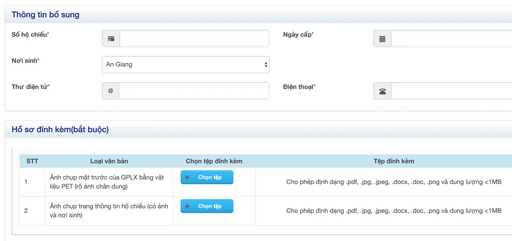 Để thao tác đăng ký được nhanh chóng, bạn cần chuẩn bị trước file ảnh chân dung, ảnh chụp mặt trước giấy phép lái xe (PET) và ảnh chụp hộ chiếu (trang có ảnh), các mục có dấu (*) là bắt buộc nhập.