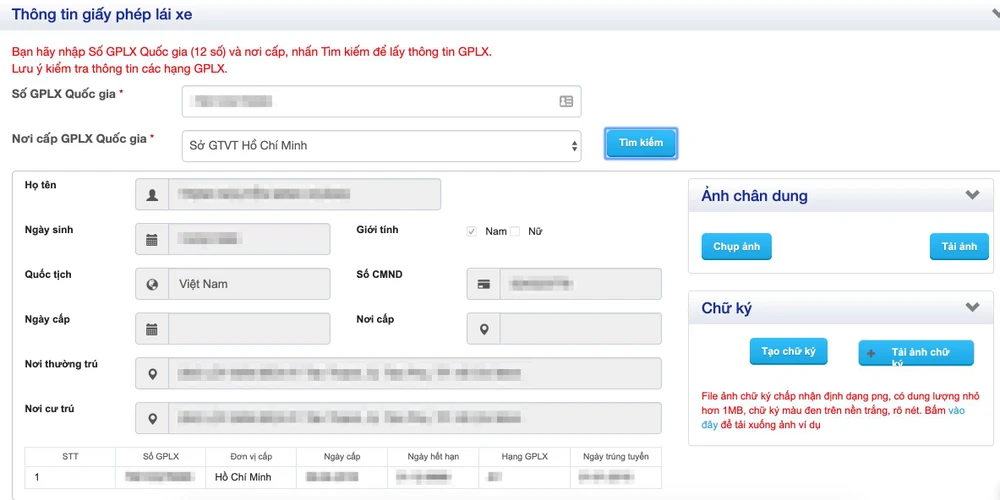 - Bước 3: Tiếp theo, bạn hãy nhập số GPLX trên thẻ PET đang sử dụng và nơi cấp rồi nhấn Tìm kiếm. Nếu mọi thứ hợp lệ, thông tin chi tiết tương ứng với số GPLX sẽ được tự động hiển thị, lưu ý, người dùng không thể chỉnh sửa được các thông tin này.