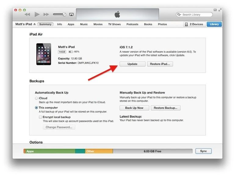 Sau bước này, kết nối thiết bị iOS với máy tính. Click vào ảnh thiết bị ở góc trên cùng bên phải iTunes, chọn Update.