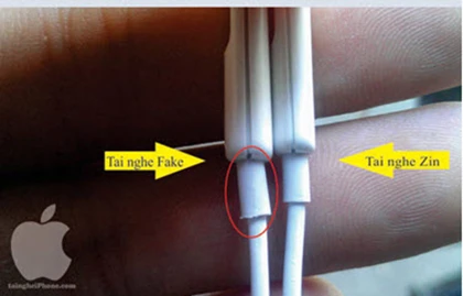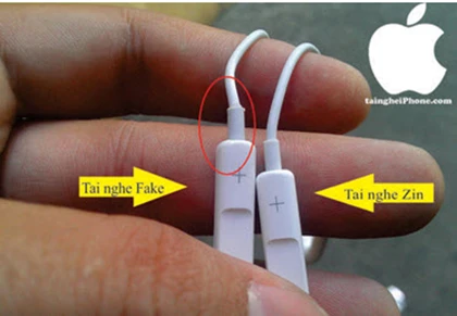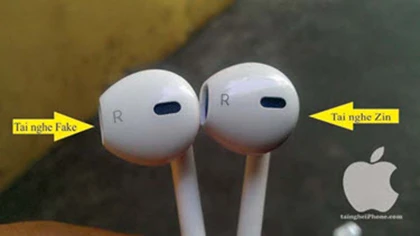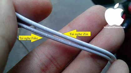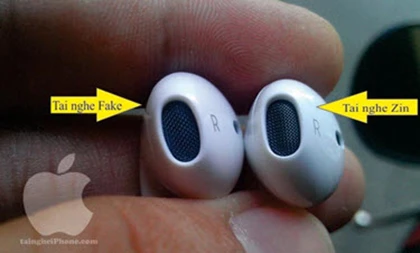 Hàng chữ Designed by Apple in California, Assembled in China. trên tai nghe zin in mờ nhưng rất sắc nét, cạo không ra, còn trên tai nghe fake in rõ nhưng cạo sẽ mất.
