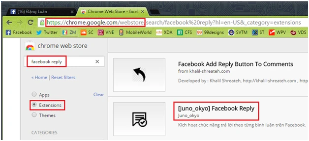 Ở khung tìm kiếm, bạn nhập vào “Facebook Reply” và tìm đến add-in của Juno Okyo (một IT blogger ở Việt Nam đã phát triển). Đơn giản hơn, bạn chỉ cần click vào link này và nhấn cài đặt.