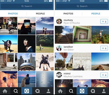 Ngoài ra, Instagram cũng cập nhập tính năng Explore giúp bạn tìm thấy những người bạn của mình một cách nhanh nhất có thể. Tính năng Expolre có biểu tượng giống như chiếc kính lúp. Khi bạn mở tính năng này, bạn sẽ thấy 2 tùy chọn là Photos và People. Trong đó, với tab People, bạn có thể kết bạn với người khác có tài khoản Instagram cũng như xác định đối tượng đó có đang “online” instagram hay không.