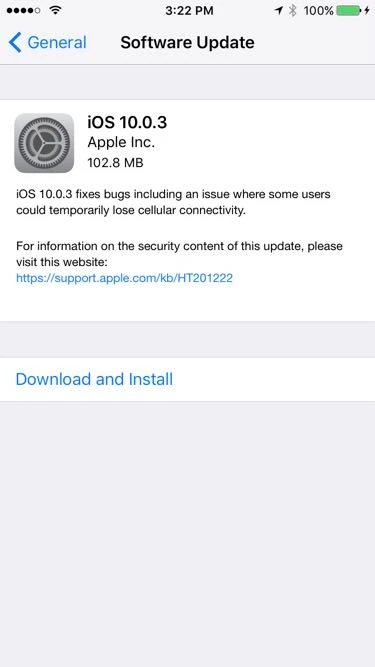 Ngay lập tức, Apple đã tung ra bản cập nhật iOS 10.0.3 (103 MB) nhằm giải quyết vấn đề, ít nhất là trên lý thuyết. Ngoài ra, bản cập nhật còn giúp khắc phục các lỗi liên quan đến âm thanh, thư viện ảnh iCloud, nâng cao hiệu quả khi chụp ảnh xóa phông…