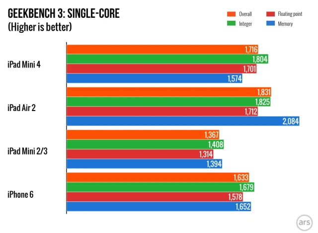 Qua só liệu thu được trên Geekbench, sự khác biệt xuất hiện chủ yếu ở những bài test đa nhân, nhưng sự khác biệt trong thực tế như thế nào, thì vẫn chưa rõ ràng, nhất là nếu bạn không có điều kiện đặt 2 chiếc iPad 4 mini và iPhone 6 bên cạnh nhau để so sánh. Tuy nhiên một điểm đáng lưu ý là tốc độ xử lí của bộ nhớ trên chiếc iPad này lại thấp hơn so với đàn anh iPhone 6, nhưng đó không phải là vấn đề lớn lắm khi mà những chiếc iPad vốn không cần quá nhiều sự quan tâm về cấu hình, nhưng vẫn nhanh và mượt mà hơn những chiếc iPhone cùng thế hệ.