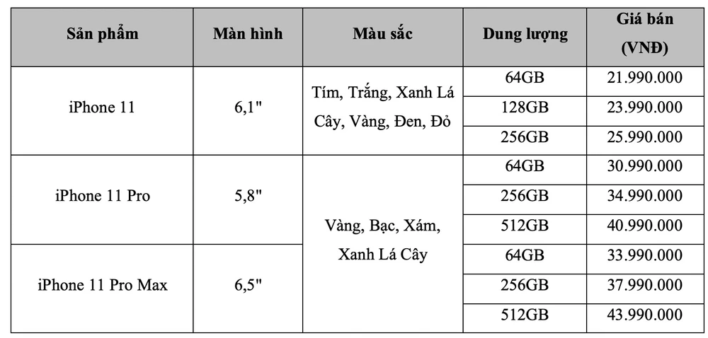 Bộ ba sản phẩm iPhone mới chính hãng sẽ có các mức dung lượng 64 GB, 128 GB, 256 GB và 512 GB. Về màu sắc, iPhone 11 Pro và 11 Pro Max sẽ có bốn màu là vàng, bạc, xám, xanh lá cây. Riêng với iPhone 11, Apple đã ưu ái trang bị sáu màu trẻ trung trên mặt kính như tím, trắng, xanh lá cây, vàng, đen và đỏ.