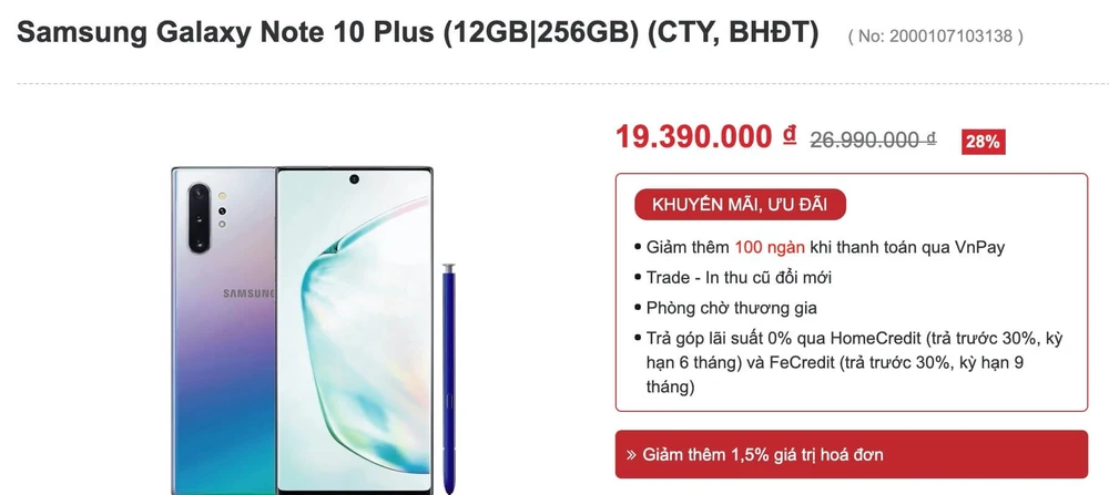 Không riêng gì iPhone mà các dòng điện thoại Android cũng đồng loạt được giảm giá trong thời gian ngắn để thu hút người dùng, đơn cử như Galaxy Note 10 Plus công ty chỉ còn 19,3 triệu đồng (giảm 7,6 triệu đồng so với giá niêm yết).