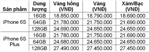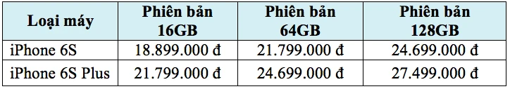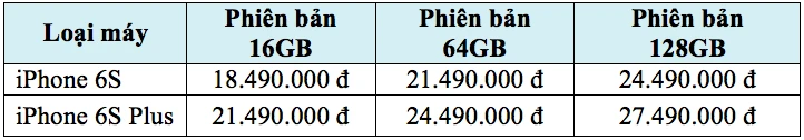 Bộ đôi iPhone 6s sẽ được bán ra với giá từ 18,89 triệu đồng phiên bản 16 GB, còn phiên bản iPhone 6s Plus 16 GB sẽ có giá 21,79 triệu đồng. Đối với phiên bản cao nhất 128 GB, iPhone 6s được chào bán ở mức 24,69 triệu đồng và 6s Plus có giá 27,49 triệu đồng.