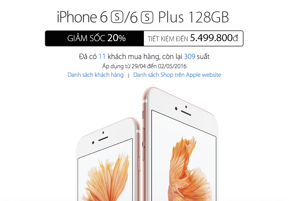Theo đó, iPhone 6S 128GB sẽ được giảm từ 24.699.000 đồng xuống còn 19.759.200 đồng. Đối với phiên bản 6S Plus 128GB, mức giá giảm là 5.5 triệu đồng (từ 27.499.000 đồng xuống còn 21.999.200 đồng). Đây là mức ưu đãi lớn nhất kể từ khi hai sản phẩm này ra mắt.