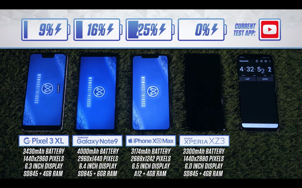 Mới đây, người dùng YouTube Mrwhosetheboss đã đăng tải video thử nghiệm thời gian sử dụng pin trên iPhone XS Max và một số thiết bị cao cấp khác gồm Samsung Galaxy Note 9, Google Pixel 3 XL và Sony Xperia XZ3.