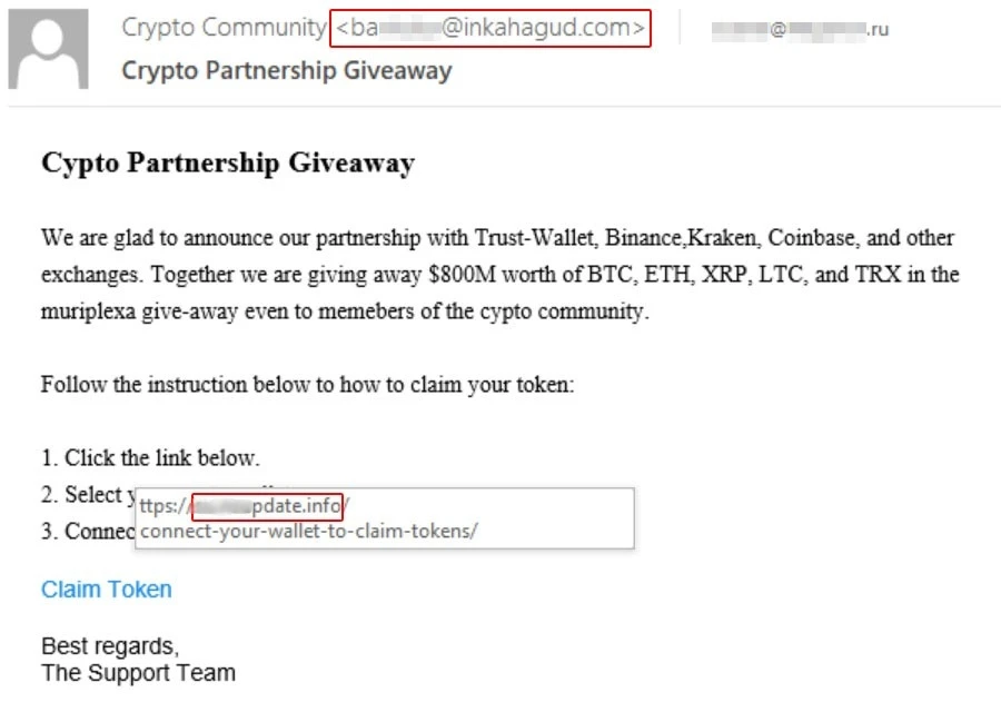 Như thường lệ, tất cả bắt đầu bằng một email. Những kẻ đứng sau kế hoạch này đã lấy mồi nhử là lời đề nghị tham gia vào chương trình tặng quà hấp dẫn về tiền mã hóa: Bitcoin (BTC), Ethereum (ETH), Litecoin (LTC), Tron (TRX) hoặc Ripple (XRP).