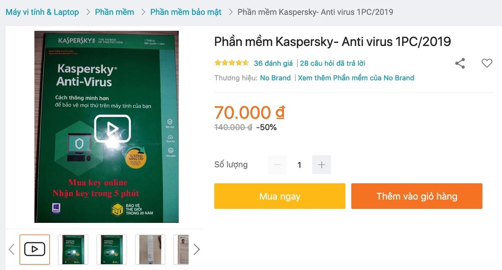 Hàng loạt cửa hàng ảo trên các mạng trực tuyến như Sendo, Tiki và Lazada… đang rao bán mã thẻ bản quyền nhiều phần mềm bảo mật, đặc biệt tập trung vào phần mềm Kaspersky với "giá sốc", tức chỉ bằng 50% so với giá niêm yết của nhà phân phối.