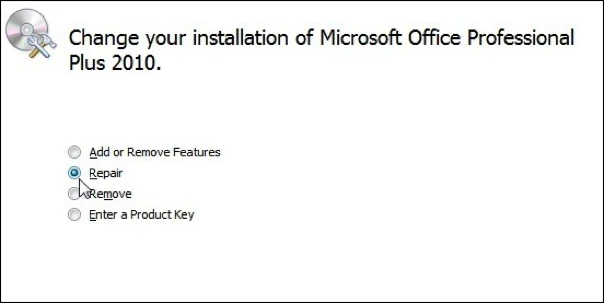 Mặc dù công cụ này đã bị loại bỏ trong phiên bản Office 2010, nhưng bạn vẫn có thể thực hiện công việc chẩn đoán và sửa chữa theo cách sau. Đầu tiên, bạn truy cập vào Control Panel > Programs and Features, kích chuột phải vào Microsoft Office 2010 và chọn Change. Trên màn hình tiếp theo, bạn chọn Repair và Microsoft Office sẽ tự động kiểm tra lỗi và tiến hành khắc phục.