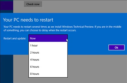 Đầu tiên, bạn nhấn vào Start menu chọn PC Settings > Update and Recovery > Preview builds rồi nhấn Download now để tải về. Quá trình này có thể sẽ mất nhiều thời gian hơn so với những cập nhật thông thường, dung lượng của bản cập nhật có thể là 2 GB hoặc 2,74 GB tùy thuộc vào phiên bản bạn đang sử dụng.