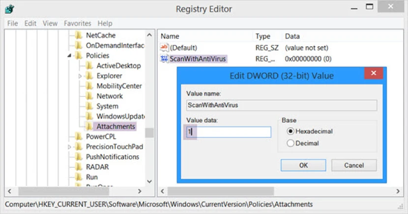 9. Hầu hết các trình duyệt sẽ tự động khởi động chương trình chống virus để quét các tập tin khi nó được tải hoàn tất. Nếu chắc chắn rằng các tập tin này an toàn, hãy vô hiệu hóa tính năng này bằng cách chỉnh sửa Registry của Windows.