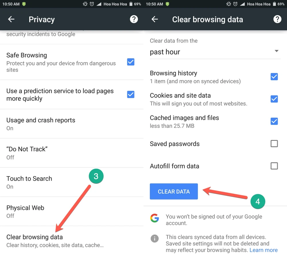 Xóa dữ liệu lướt web trên Android. Ảnh: M.HOÀNG