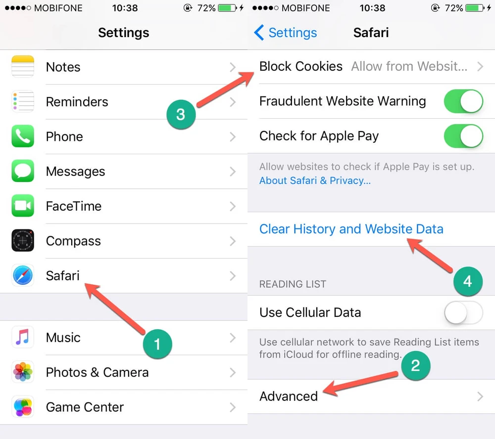 Xóa sạch lịch sử lướt web và cookies trên các thiết bị iOS. Ảnh: M.HOÀNG