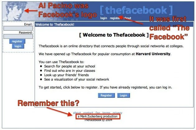 Mạng xã hội lớn nhất hành tinh có tên gọi cũ là “thefacebook”, với logo là hình diễn viên Al Pacino. Cuối trang từng có dòng chữ “a Mark Zuckerberg production” với ý nghĩa đây là sản phẩm của Mark Zuckerberg.