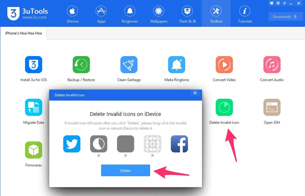 Để sử dụng, bạn hãy chuyển sang mục Toolbox (hộp công cụ) > Delete Invalid Icon (xóa biểu tượng không hợp lệ) > Delete và chờ một lát cho đến khi quá trình này kết thúc. Lưu ý, nếu các biểu tượng không hợp lệ vẫn tồn tại, người dùng chỉ cần nhấn im lên biểu tượng để xóa hoặc khởi động lại thiết bị.