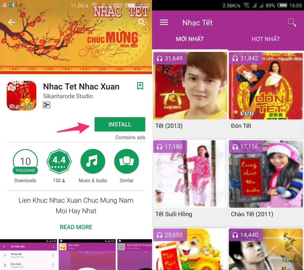 Ứng dụng sẽ tổng hợp các album nhạc tết, nhạc trẻ, nhạc vàng, nhạc trữ tình… từ nhiều nguồn khác nhau. Giao diện ứng dụng khá đơn giản với hai mục chính gồm Mới nhất và Hot nhất.