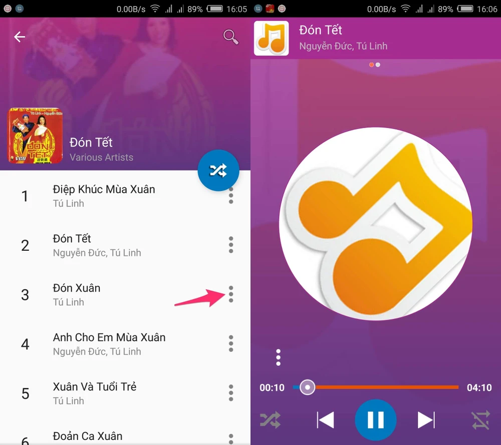 Trong mỗi album sẽ có rất nhiều bài hát khác nhau, người dùng có thể chạm vào biểu tượng ba chấm để tải về làm nhạc chuông, báo thức hoặc phát ngẫu nhiên một bài hát bất kì thông qua các nút chức năng tương ứng. Theo ghi nhận, ứng dụng có thể phát nhạc trơn tru ngay cả khi gói cước data bạn đang sử dụng đã hết tốc độ cao.