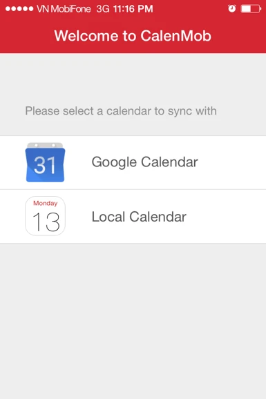Ở giao diện đầu tiên Please select a calendar to sync with, bạn chọn Google Calendar (đồng bộ với lịch của Google Calendar) hay Local Calendar (đồng bộ với ứng dụng lịch mặc định trên thiết bị), nhấn OK ở thông báo CalenMob would like to access your calendar để cho phép truy cập vào lịch. CalenMob hoạt động thời gian thực, tự động cập nhật các thay đổi. Ngoài ra, bạn có thể tạo sự kiện ở chế độ offline và ngay khi có kết nối, CalenMob sẽ tự động đồng bộ dữ liệu.